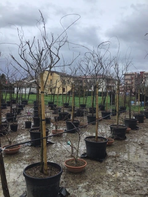 De Wisteria floribunda ‘Snow Showers’ is een wit bloeiende blauwe regen. Het gaat hier om een exemplaar als boom (op stam van zo’n 180cm). Wisteria ‘Snow Showers’ bloeit uitbundig met fijne bloemen in witte trossen in rond juni.