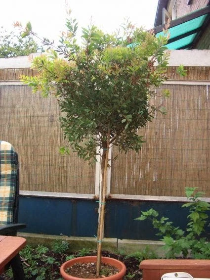 Callistemon laevis (Lampepoetserplant op stam) is een groenblijvende struik met brede bladeren, die bronsrood zijn bij het uitkomen en daarna grijsgroen. Bloeit in mei-juni en nadien nogmaals in de zomer en in de herfst.