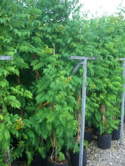 Trompetbloem (Campsis tagliabuana ‘Madame Galen’) is een snel groeiende klimplant, en is een resultaat van de kruising tussen de grandiflora uit China en radicans uit midden Amerika, die voorkeur voor warme streken heeft deze plant ook meegenomen naar ons klimaat. Hoewel de plant in ons klimaat zich prima kan vinden, zult u merken dat een warme en zonnige plek de bloei, en de groei van de Trompetbloem zal bevorderen. Een pergola, patio, of een warme buitenmuur zijn de plekken die deze klimplant zou uitkiezen om zich aan vast te hechten met zijn hechtwortels. De jongere scheuten hebben wel enige ondersteuning nodig om een mooie groei te krijgen. De Trompetbloem (Campsis tagliabuana ‘Madame Galen’) staat het liefst op de meest zonnige plek, en zal zijn mooie plekje belonen met prachtige oranjerode bloemen waar u in augustus en september van kunt genieten. Wanneer de Trompetbloem te weelderig groeit, dan kunt u gerust de lange loten, na de bloei, terug knippen voor een vollere struik